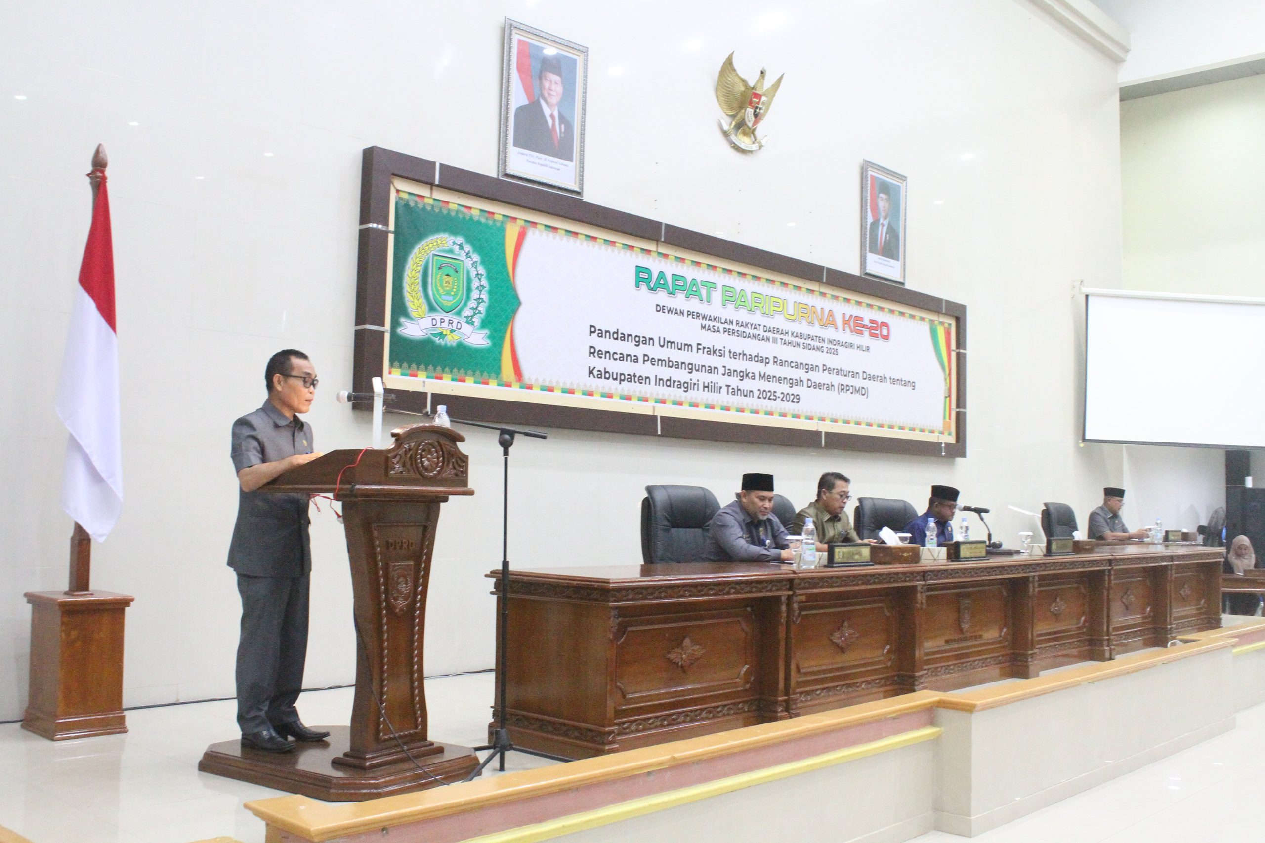 DPRD INHIL, TEMBILAHAN - Dewan Perwakilan Rakyat Daerah (DPRD) Kabupaten Indragiri Hilir menggelar Rapat Paripurna Ke-20 Masa Persidangan III Tahun Sidang 2025. Agenda rapat ini membahas pandangan umum fraksi terhadap pidato Bupati Indragiri Hilir mengenai Rancangan Peraturan Daerah tentang Rencana Pembangunan Jangka Menengah Daerah (RPJMD) Kabupaten Indragiri Hilir Tahun 2025–2029.