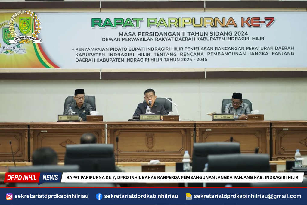 Adapun agenda rapat paripurna ke - 7 masa persidangan II tahun 2024 adalah penyampaian pidato Bupati Indragiri Hilir penjelasan rancangan peraturan daerah kabupaten Indragiri Hilir tentang rencana pembangunan jangka panjang daerah Kab. Inhil tahun 2025-2045.