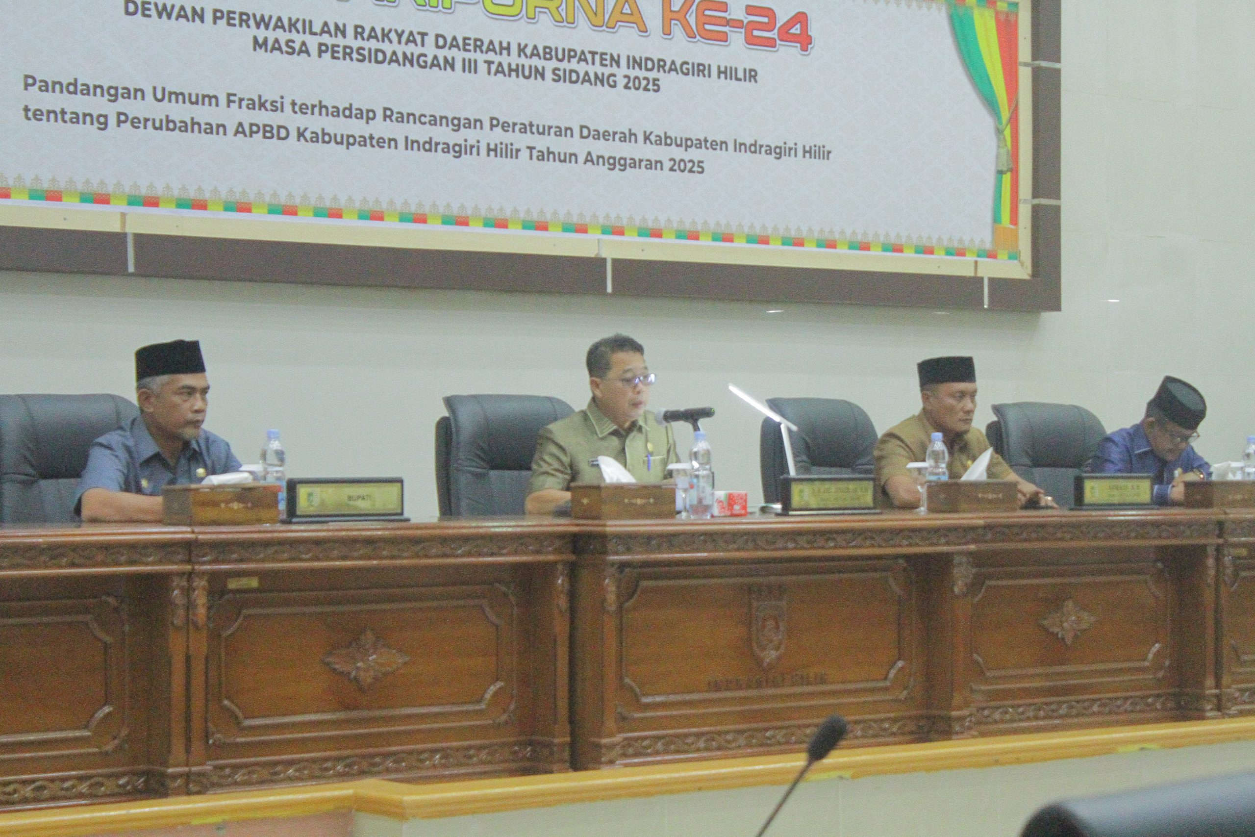 DPRD INHIL, TEMBILAHAN - Dewan Perwakilan Rakyat Daerah (DPRD) Kabupaten Indragiri Hilir menggelar Rapat Paripurna Ke-24 Masa Persidangan III Tahun Sidang 2025 di ruang rapat utama DPRD Inhil. Agenda rapat kali ini membahas pandangan umum fraksi-fraksi terhadap Rancangan Peraturan Daerah tentang Perubahan Anggaran Pendapatan dan Belanja Daerah (APBD) Kabupaten Indragiri Hilir Tahun Anggaran 2025.